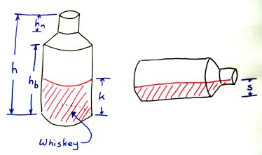 Our question to you is this: assuming that the depth of whiskey in the can was k cm with the can sitting upright, what is its depth with the can lying horizontal? The can itself is made of two cylinders: the body with height hb and diameter db, and the neck with height hn and diameter dn. The neck and body are joined by a tapered conic shoulder such that the overall height of the can is h. The bottom and lid of the can are disks of diameter db and dn respectively.